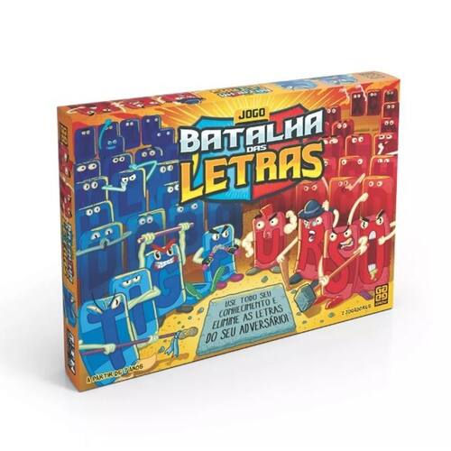 Batalha das Letras - Grow. Use todo seu conhecimento e elimine as letras do seu adversário. Um tema é escolhido, como FRUTAS, CARROS, FLORES, CORES, etc. Então a criança lança o dado, para sortear uma letra. Em seguida, fala uma palavra do tema escolhido iniciada pela letra sorteada. Por exemplo: o tema escolhido é FRUTA, e a letra sorteada é M. Neste caso, a criança pode falar MORANGO. A partir daí, as letras M, O, R, A, N e G do suporte adversário devem ser retiradas. Segurança Inmetro - CE - BRI/CEPEX-N 01024-25 NBR NM 300/2004 - Segurança de Brinquedos - Fundação Abrinq - Empresa Amiga da Criança, - Atenção Não recomendável para menos de 03 anos. Ean: 7908010132045