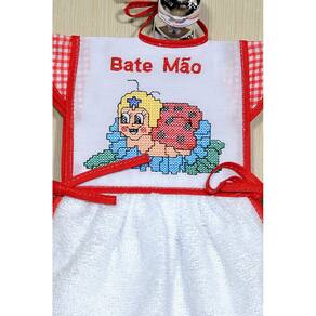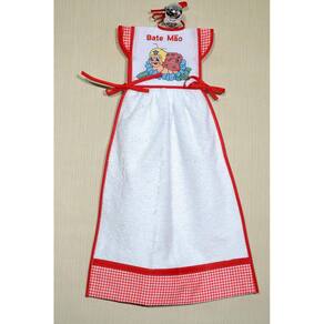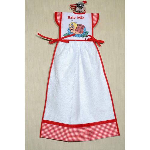 Bate mão fabricado em tecido atoalhado na cor branco, com formato de vestido, barrado branco bordado em ponto cruz com uma joaninha, corações e flores, detalhes em tecido xadrez vermelho e branco e acabamentos em viés e laços na cor vermelho.