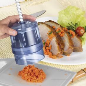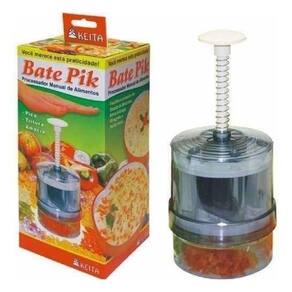 Bate Pik Keita o Verdadeiro Picador e Processador Manual de Alimentos O processador manual de alimentos da Keita facilita a sua vida na cozinha, pica e tritura alimentos, de forma fácil e rápida. Também é fácil de lavar. As facas giratórias em inox cortam e trituram os alimentos para seus pratos. Você fará salada de maionese, arroz à grega, vinagrete e outros alimentos com muita rapidez e praticidade. Pica ou tritura: Legumes, grãos, queijos, frutas, ovos, peito de frango, frios, peixes, salsichas, verduras, etc... Amacia: Bife Fácil de usar: Posicione o Bate Pik sobre o alimento e: Para picar ou triturar bata firmemente no batedor até atingir o resultado desejado. Para amaciar a carne bata suavemente no batedor até atingir o resultado desejado. Triturar alho: coloque o Bate Pik sobre 3 ou 4 dentes de alho e bata suavemente no batedor por 4 vezes aproximadamente. Separe a casca e continue a triturar o alho até obter o resultado desejado.