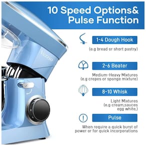 A batedeira de cozinha Vezzio possui um motor de alto desempenho de 660 W que amassa e mistura com velocidade extremamente rápida, mas opera silenciosamente a 60,0 DB. O controle de 10 velocidades com função pulsar permite que você prepare uma variedade de receitas, de massa a sorvete, de clara de ovo a massa de pão, tornando a a batedeira preferida para os aficionados da panificação.
