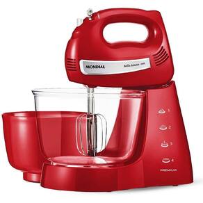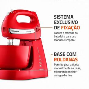 Bonita, com design moderno e na cor vermelha, deixará sua cozinha mais elegante e equipada. Seus batedores são resistentes e de aço cromado. Versátil, vem com duas tigelas com capacidade para 4 ou 2,3 litros uma delas é transparente, possibilitando a visualização da receita durante o preparo, além da praticidade de poder fazer diferentes etapas de suas receita ao mesmo tempo, usando recipientes diferentes.
