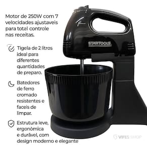 Batedeira Elétrica de Mesa 7 Velocidades com Tigela 2L 250W Preta 220V para Massas e Cremes