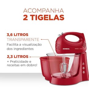 A batedeira Prática Due Black B-45-R Vermelha tem 400W de potência, vem com 2 tigelas (3.6L e 2.3L), tem 3 velocidades, função turbo e batedores de aço cromado: performance, praticidade, e versatilidade para massas, bolos e receitas! A Due Red traz o melhor resultado nas receitas do dia a dia, sejam bolos de chocolate, fubá, ou massas. Vem com 2 tigelas, uma maior de 3,6L (litros) e uma menor, de 2,3L (litros): prepare mais de uma receita com muitos ingredientes. Tem 3 velocidades e também função turbo, que aumenta o batimento, garantindo eficiência para suas receitas. Com o botão ejetor, os batedores (pás) soltam facilmente para limpeza, e o exclusivo sistema de fixação a faz mais prática de montar. Os batedores (pás) são de aço cromado, o que garante mais durabilidade e resistência. Alta performance para quem busca praticidade e precisão ao criar receitas especiais. Uso doméstico. 1 ano de garantia.