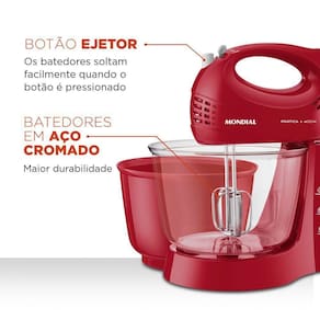 A batedeira Prática Due Black B-45-R Vermelha tem 400W de potência, vem com 2 tigelas (3.6L e 2.3L), tem 3 velocidades, função turbo e batedores de aço cromado: performance, praticidade, e versatilidade para massas, bolos e receitas! A Due Red traz o melhor resultado nas receitas do dia a dia, sejam bolos de chocolate, fubá, ou massas. Vem com 2 tigelas, uma maior de 3,6L (litros) e uma menor, de 2,3L (litros): prepare mais de uma receita com muitos ingredientes. Tem 3 velocidades e também função turbo, que aumenta o batimento, garantindo eficiência para suas receitas. Com o botão ejetor, os batedores (pás) soltam facilmente para limpeza, e o exclusivo sistema de fixação a faz mais prática de montar. Os batedores (pás) são de aço cromado, o que garante mais durabilidade e resistência. Alta performance para quem busca praticidade e precisão ao criar receitas especiais. Uso doméstico. 1 ano de garantia.Modelo - B-45-RCor - VermelhoTipo de batedeira - Batedeira ComumVoltagem (Tensão) - 127V/220VItens inclusos - 01 Batedeira - Manual de InstruçõesNúmero de velocidades - 3 velocidades + turboCapacidade em litros - 3,6L e 2,3LMaterial - PPTipo de tomada - 10AAlimentação - Energia ElétricaPotência - 400WTipo de batedores - Batedores em Aço CromadoQuantidade de tigelas - 2Comprimento do cabo - 1,50mPeso - 1,800kgDimensões do produto - 34,6cm x 22cm x 32,4cm (AxLxP)Garantia - 1 ano