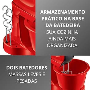 -Motor de 400 W: Um motor potente com o qual é possível preparar receitas complexas, como massas de pães. -Cinco velocidades + função turbo: Massa homogênea sem esforços! -Tigela plástica de 3,5 L: Atendendo a necessidade de diversas receitas! -Sistema FlexiMix: Alcança todos os cantos garantindo que toda massa seja incorporada sem a necessidade de ferramentas extras ou pausas para raspar as laterais. -Armazenamento prático para acessórios -Multiuso: Tigela removível -Projeto Ergonômico: Fácil de segurar, usar e controlar em uma mão. -Pedestal para batedeira e recipiente -Botão TURBO -Dois Batedores: Massas leves e pesadas
