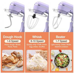 Acessórios inclusos: Gancho para massa (dough hook), batedor (beater), fouet (whisk), protetor de respingos, tigela inox