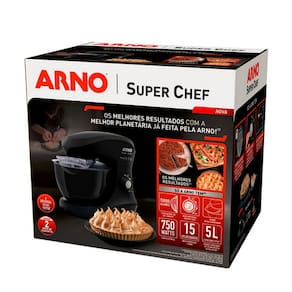 ESPECIFICAÇÕES TÉCNICAS Marca: Arno Modelo: Super Chef KM00/01 Cor: Preto Potência: 750W Frequência: 60Hz Voltagem: 220V Velocidades: 15 velocidades Capacidade: 5 litros Quantidade de batedores: 3 batedores Material dos batedores: Aço inoxidável Função turbo: Sim Base antiderrapante: Sim Inmetro: Sim Dimensões do Produto (AxLxP): 28.7 x 34.4 x 34.4 cm Dimensões da Embalagem (AxLxP): 35.0 x 40.0 x 41.0 cm Peso Líquido: 3.5 Kg Peso Bruto: 7.0 Kg Garantia: 12 Meses
