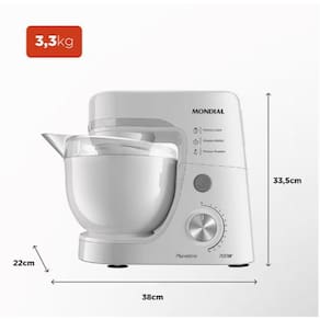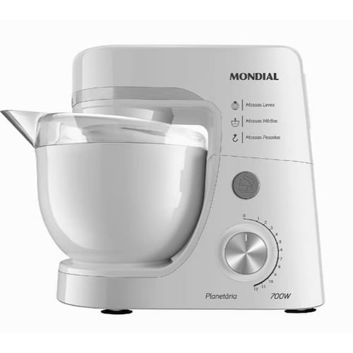 Informações Técnicas: Marca Mondial Frequência 60 Hz Potência 700W / 127V Tipo de batedeira Com pedestal Quantidade de velocidades 12 Funções Amassar, Bater, Misturar Com função rotativa Sim Capacidades das tigelas 4,5L Quantidade de tigelas 1 Peso 4.5 kg Garantia: 12 meses