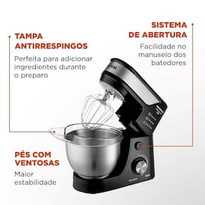 O sistema de abertura superior proporciona agilidade na troca dos batedores e no manuseio geral do equipamento. Já os pés com ventosas antiderrapantes garantem firmeza e segurança durante o uso, mesmo em superfícies lisas. Acompanha também uma espátula que auxilia na remoção completa dos ingredientes da tigela, evitando desperdícios.