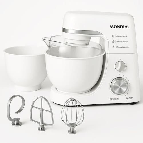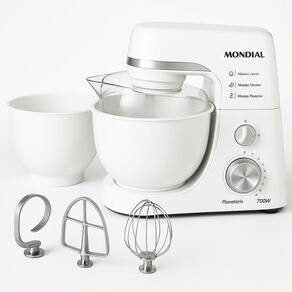 Batedeira Planetária Mondial BP-03W-2B Com 12 Velocidades 700W Branca Voltagem: 220V Descubra a potência e a elegância da Batedeira Planetária Mondial BP-03W-2B, perfeita para quem ama cozinhar com praticidade e alto desempenho. Com 700w de potência, ela é ideal para preparar desde bolos fofinhos até massas pesadas, como pães e pizzas.