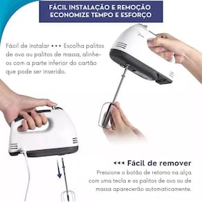 7 velocidades para ajuste preciso conforme a necessidade da receita. Botão de ejeção com dispositivo de segurança para facilitar a troca dos batedores. Fácil limpeza e manutenção, garantindo praticidade no dia a dia da cozinha. Versatilidade para preparar diversos tipos de alimentos, desde bolos até purês e molhos.