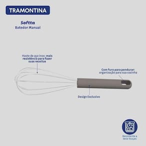 Misturas mais leves, preparo mais ágil. O batedor manual Tramontina Softta em aço inox com cabo emborrachado cinza facilita cada etapa da receita. Com pontas em silicone resistente a até 210 C, ele protege panelas com revestimento antiaderente e evita riscos durante o uso. O cabo com toque suave garante firmeza nas mãos, enquanto o visual contemporâneo em tom cinza combina com qualquer cozinha. Um aliado prático para bater massas leves, ovos ou molhos sem esforço, com a qualidade que só a Tramontina oferece.