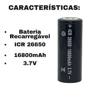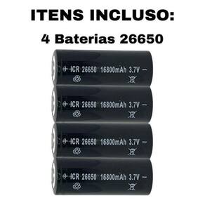 Este anúncio contém: 4 Baterias 26650; Características: Bateria de alta capacidade; Modelo: 26650; Capacidade: 16800mAh; Voltagem: 3.7v; Dimensões: Altura: 7 cm; Largura: 3 cm; O produto anunciado é uma bateria 26650, não é uma pilha, não utilize este produto para substituir pilhas pois pode queimar o seu aparelho. Estas baterias são projetadas para se adaptar perfeitamente a uma variedade de dispositivos, desde lanternas até microfones e outros equipamentos eletrônicos. A sua versatilidade torna-as indispensáveis para qualquer pessoa que dependa de fontes de energia eficientes e de alta qualidade. Com uma incrível capacidade, estas baterias fornecem uma fonte de energia robusta e duradoura. Nunca mais se preocupe com quedas de energia repentinas ou interrupções nas suas atividades. Desfrute de horas ininterruptas de iluminação potente ou de gravações impecáveis. Esqueça a necessidade constante de comprar pilhas descartáveis. Com as Baterias Recarregáveis, você pode recarregar facilmente para um desempenho consistente. Além de ser uma escolha sustentável, você economizará dinheiro a longo prazo, investindo em um produto que pode ser recarregado centenas de vezes. Orientações Quanto a Bateria: Não deixe sem carga pois isto afeta diretamente a vida útil da Bateria. Carregamento total de 10 à 12 Horas. Aguarde até que sua total capacidade de carga esteja completa. Seja bem vindo Você chegou em uma equipe especializada para melhor te atender. Todas as fotos são de produtos reais e de exclusividade da nossa loja, sendo assim apenas nós temos o direito de imagem sob qualquer mercadoria anunciada. Veja nossos outros produtos um pouco mais abaixo em Mais Anúncios do Vendedor. Você chegou até aqui se você tem alguma dúvida pendente sobre o produto anunciado nos diga. Estamos sempre aqui para lhe responder sempre A Nossa empresa é extremamente e especializada com produtos de alta qualidade, pois nosso objetivo é ver vocês clientes satisfeitos com os produtos e atendimento. Perguntas e Respostas: Vocês enviam para todo o Brasil Quanto fica o e qual o prazo de entrega R: Enviamos para todo o Brasil. Para conferir o ou o prazo basta verificar no campo acima, ao lado das fotos, ou entrar em contato conosco para mais informações, caso ainda tenha dúvidas. Esse produto vem bem embalado R: Sim, todos nossos produtos são muito bem embalados para evitar qualquer chateação para nossos clientes. Ele vem igual está na foto R: Sim, as fotos de nossos produtos são tiradas por nós, para garantir melhores detalhes de informações visuais, garantindo assim melhor entendimento de como realmente é o produto. Produtos que Utiliza essa Bateria: Lanternas LED de alto desempenho; Lanternas de mergulho; Sistemas de energia portátil ou bancos de energia; Lanternas táticas recarregáveis; Equipamentos de camping, como lanternas de acampamento ou carregadores solares portáteis; Lanternas de busca e resgate; Equipamentos de fotografia, como flashes ou iluminadores LED; Lanternas de bicicleta ou faróis para bicicletas elétricas; Lanternas de segurança para uso em locais remotos ou de emergência; Equipamentos de segurança industrial, como lanternas intrinsecamente seguras. Marca: Não Informado