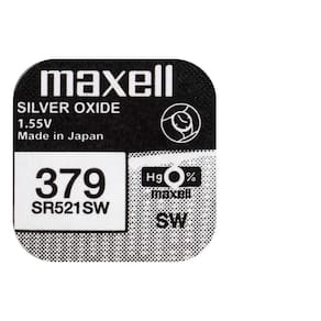 Utilizada em relógios Fabricação no Japão Marca Maxell Modelo 379 Tamanho da pilha SR521SW Forma Botão Formato de venda Cartela Unidades por kit 5 Tamanho: 5.8mm, altura 2.15mm Tensão V : 1.55V Corrente A : 16mAh Química: Óxido de Prata É recarregável: Não