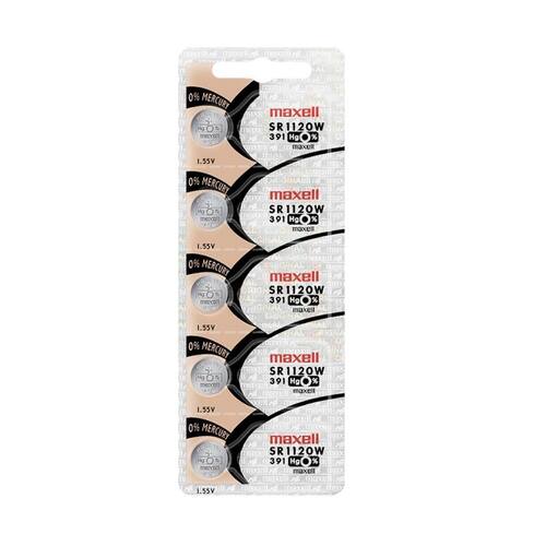 Bateria para relógio de pulso Maxell 391 / SR1120W, excelente qualidade e durabilidade Utilizada em relógios Fabricação no Japão Marca Maxell Modelo 391 Tamanho da pilha SR1120W Forma Botão Formato de venda Cartela Unidades por kit 5 Tamanho: Largura 11.6mm, altura 2.05mm Tensão V : 1.55V Corrente A : 55mAh Química: Óxido de Prata É recarregável: Não Embalagem 3 Meses Marca: Não Informado