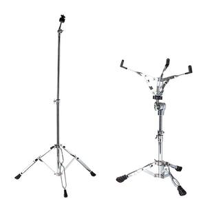 CARACTERÍSTICAS Pé de bumbo telescópio Caneca de fixação refprçada Pele de bumbo com anel abafador Cascos de 7 MM Caneca tipo abraçadeira Automático de gaveta Tom Holder - Joint Ball Travas com Memórias Base de banco fundida Banco reforçado Estante de caixa com cesto Borboleta "Safecymbals" Pedal de bumbo profissional Base de metal Corrente dupla Sistema de Mola com Rolamento HI HAT 14" e Crash/Ride 18" Estante Reforçada