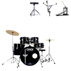 1 Banco 1 Estante Reta 1 Máquina de Chimbal 1 Pedal Single 1 Estante de Caixa 1 Par de Prato Hi-Hat 1 Prato Crash Ride