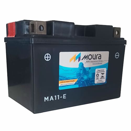 CARACTERÍSTICAS: - Capacidade (C10): 11 Ah - CCA ABNT (-10º): 110 A - Certificações: Inmetro - Dimensões (CxLxA): 150x87x110mm - Fabricante: Moura - Modelo: MA11-E - Parafuso: 6 x 13mm - Polaridade: Esquerda - Porca: 6 mm Plana - Tensão: 12 V