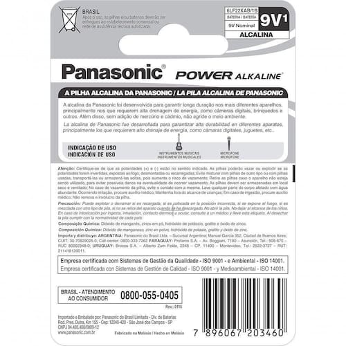 Bateria Alcalina 9v 6lf22xab/1b24 Informações do produto: A Bateria Alcalina 9V Panasonic oferece uma fonte confiável e duradoura de energia para diversos dispositivos eletrônicos. Ideal para uso em equipamentos como alarmes de segurança, controles remotos, e dispositivos de medição, esta bateria alcalina garante um desempenho consistente e prolongado. Com tecnologia avançada, ela proporciona uma alta capacidade de energia e uma vida útil superior, além de ser resistente a vazamentos. Características: Tipo: Bateria alcalina Voltagem: 9V Uso: Ideal para alarmes, controles remotos e dispositivos de medição Durabilidade: Alta capacidade e longa vida útil Resistência: Resistente a vazamentos