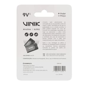 Bateria Alcalina 9v - Vb9vb1 BATERIA ALCALINA 9V - VB9VB1As pilhas e baterias Vinik são a escolha perfeita para diversas situações, oferecendo desempenho confiável e durabilidade para todos os tipos de dispositivos. Seja para controles remotos, videogames, lanternas, sensores, brinquedos ou muitos outros aparelhos, nossas pilhas garantem energia quando você mais precisa.Disponíveis em uma ampla variedade de tipos e tamanhos, projetadas para atender às suas necessidades com eficiência e qualidade.Mais potência por menos preço.CaracterísticaTipo: Bateria AlcalinaModelo: 6LR61 - 9VVoltagem: 9VBlister: 1 unidade Ean: 7908445435902
