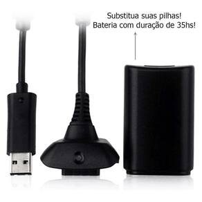 Conjunto composto por bateria recarregável com cabo e carregador para controle de videogame 360 na cor preta, garantindo autonomia prolongada e carregamento prático sem interrupções durante o jogo.