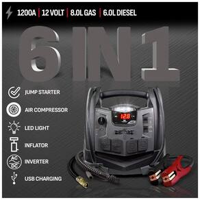 Oferece 1200 Peak Amps para saltar iniciar o seu veículo Características 2 120V AC e uma porta USB para poweer seus dispositivos Inclui compressor de ar 150PSI com calibre de pressão, bicos e área de zenamento Display digital monitora o nível de carga da bateria interna e tensão de bateria do veículo Funciona com motores V8. Construído para início de salto pesado, o SJ1332 é perfeito para o motor de partida de baterias robustas, bem como fornecer energia AC em movimento. A partir da linha Jump Starters da Schumacher, esta unidade oferece 2 saídas AC, uma porta USB e um compressor de ar. Esta unidade fornece 1200 Peak Amps para dar partida em veículos em emergências. O mostrador digital monitora o nível de carga da bateria interna e a voltagem da bateria do veículo. Inclui luz embutida com LEDs ultra brilhantes com eficiência energética. A Schu Eco Energy atende aos mais altos padrões do setor Marca: Não Informado