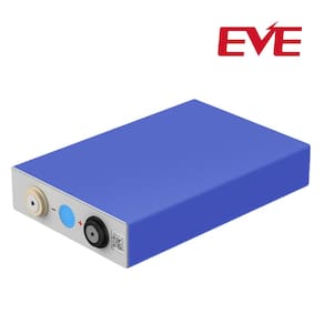 Célula de bateria recarregável de lítio lifepo4 da fabricante eve, modelo lf105, tensão 3.2v e capacidade de armazenamento de 105ah, para aplicações em veículos elétricos, carros de golf, energia solar off grid e híbrido, iates e outros equipamentos elétricos que necessitam armazenamento de energia.