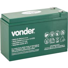 Marca: VonderConteúdo da embalagem:1 Bateria.Destaques e diferenciais:Bateria de íons de lítio, garantindo alta eficiência de operação.Aplicações e dicas de uso:Indicado para reposição no Pulverizador costal, 2 em 1, 18 litros, VONDER 62.40.008.018 .Detalhes TécnicosTipo de bateria: Íons de lítio Tensão V : 12 V Capacidade da bateria A : 8,0 Ah Indicador de bateria fraca: Não Massa aproximada peso kg : 0,65 kg - E CDC : legal: 90 dias