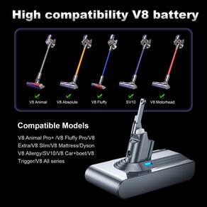 - ?Potência atualizada de 8000 mAh para tempo de execução prolongada?Projetada especificamente como uma bateria de substituição para aspiradores sem fio V8 (Absolute, Animal, Fluffy, Motorhead, SV10 e todos os modelos da série V8), esta bateria de substituição EVSUO V8 oferece desempenho de alta capacidade de 21,6 V/8000 mAh. Aproveite até 60+ minutos no modo padrão e 8-12 minutos no modo MAX, garantindo uma limpeza profunda ininterrupta para casas grandes. Perfeito para pelos de animais de estimação, tapetes e pisos duros.