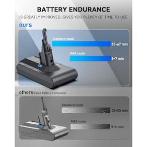 - MAIS POTÊNCIA, MAIS DURABILIDADE: A bateria v8 de longa duração atende às necessidades de limpeza profunda de sua sala grande. A bateria de 6500mAh para dyson V8 está equipada com um chip de bateria premium atualizado. A bateria de substituição V8 tem maior duração e carregamento mais rápido.