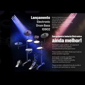 A Bateria Eletronica Drum Bass 10902 é um instrumento excepcional, voltado especialmente para o público iniciante, acompanha kits de bateria, pedal de bumbo com pad, pad de caixa com Dual Zone, pratos com efeito Choke e muito mais.
