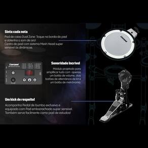 Além disso, este modelo é constituído por sonoridade incrível, com modulo projetado para simplificar tudo com apenas um botão de volume, dois botões de alternância de kit e um botão de metrônomo.