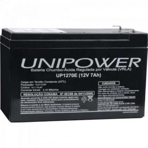 Suas aplicações incluem sistemas de alarmes, luzes de emergência, nobreaks e controles de acesso. Voltagem:12V Amperagem:7Ah Dimensões:151x65x100mm (CxLxAT) Pesquisa:bateria|selada|up-1270E|up 1270|up1270|unipower|nobreak|