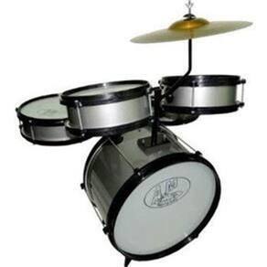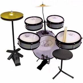 1 bumbo; 1 caixa; 2 tom; 3 prato de ferro pintado; 1 surdo; 1 banco; 1 pedal; 1 suporte do tom e prato; 1 pé do surdo; 1 par de baquetas; 1 máquina de chimbal Peso: 8 kg. Dimensões (l x a x p): 45 x 60 x 40 cm Intensidade do som produzido: 30 decibéis. Indicado para crianças de 3 a 8 anos
