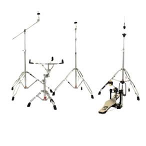 Ferragens: 02 Estantes de prato reta e girafa 01 Máquina de chimbal 01 Estante de caixa 01 Pedal de Bumbo Simples 01 Tom Holder joint ball 01 Banco