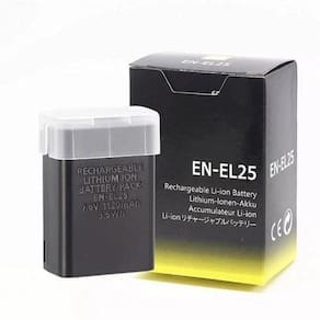 Alimente a câmera sem espelho nikon z 50 com esta bateria de íon de lítio recarregável en-el25, que serve como sobressalente ou substituta para a fornecida com a câmera. Ele é projetado para oferecer vida longa e energia consistente e pode ser carregado ou descarregado a qualquer momento sem desenvolver efeitos de memória.