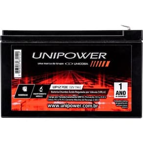 Ficha Técnica: Marca: UnipowerModelo: UP1270EVoltagem: 12VAmperagem: 7AhDimensões: 151x65x100mm (CxLxAT)Composição: Chumbo-ácido VRLA - Tecnologia AGMVida útil: de 3 a 5 anosManutenção: Livre de manutençãoGarantia: 12 meses (até 12Ah) / 18 meses (acima de 12Ah)Segurança: Válvulas de segurança