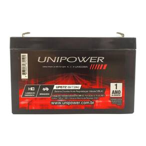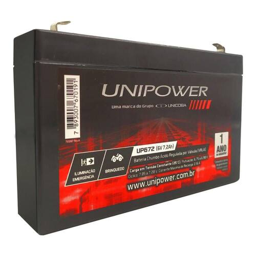 Bateria Selada VRLA 6V 7,2Ah UP672 Unipower Com o aumento de equipamentos que precisam de bateria para o seu funcionamento, a Bateria Selada VRLA 6V 7,2Ah UP67 é o a melhor opção para mantê-los funcionando com qualidade e maior durabilidade.