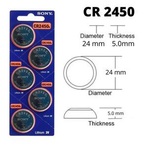 Modelo - cr2450 Marca sony murata Quantidade 5 unidade Tipo de bateria: lítio Tensão nominal: 3v Tamanho da célula: moeda Iec: cr2450 Tipo de embalagem: cartela com 01 unidade Dimensões do corpo: 24.7 x 5mm Recursos da bateria: não recarregável