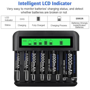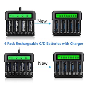 Pacote com 4 baterias recarregáveis tamanho C da CITYORK com carregador de bateria universal AA AAA C D de 8 compartimentos - Carregador de bateria LCD AA AAA C D independente: para 4 slots para baterias recarregáveis C/D Ni-MH de 1/2/3/4 peças ou 8 compartimentos para baterias recarregáveis AA/AAA Ni-MH de 1/2/3... 7/8 peças. - Carregador de bateria rápido: entrada USB 5V/2A e tipo C; Tecnologia inteligente de detecção automática O carregador pode detectar automaticamente a condição das baterias. Detecção de bateria não recarregável e com defeito. - Sem efeito de memória: sem efeito de memória em nossa bateria C recarregável, carregue suas baterias a qualquer momento. Mesmo quando estiverem quase esgotados ou parcialmente esgotados, você não precisará se preocupar com os efeitos de memória de longo prazo e obterá a capacidade total para cada uso. - Conteúdo da embalagem: 1 carregador de bateria+4 baterias recarregáveis Ni-MH C Cell +2 estojos de bateria. (O compartimento da bateria impede que as baterias sofram curto-circuito ou descargas indesejadas e garante armazenamento e proteção ideais.) - Nosso Atendimento ao Cliente: Se você tiver alguma dúvida (seja sobre a qualidade do produto, uso ou outros problemas), sinta-se à vontade para entrar em contato conosco e nossa equipe de atendimento ao cliente ficará feliz em ajudá-lo.