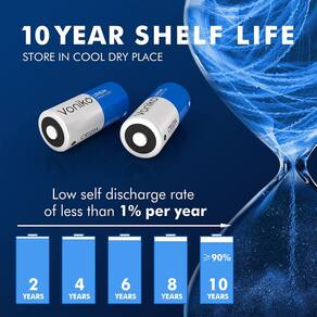 - Vida útil total de 10 anos – Use-as imediatamente ou guarde-as para uma emergência futura – você pode ter certeza de que as baterias não recarregáveis CR123a permanecerão tão frescas quanto no dia em que você as adquiriu até 10 anos a partir de agora. Com operação de temperatura extrema, Voniko = sempre pronto para usar. Armazene a cerca de 20 °C para melhores resultados.