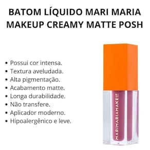 Uma embalagem sofisticada e prática, o Batom Líquido Creamy Matte Mari Maria Makeup possui cores intensas, textura aveludada e alta pigmentação. Sua fórmula é leve e proporciona um acabamento matte que dura o dia todo, sem tirar o conforto dos lábios e sem transferir. Possui um aplicador moderno que facilita o contorno da boca e promove um acabamento mais preciso.Sua fórmula hipoalergênica é leve e proporciona um acabamento Matte que dura o dia todo, sem tirar o conforto dos lábios e sem transferir. Possui um aplicador moderno que facilita o contorno da boca e promove um acabamento mais preciso. Redescubra lábios intensos e apaixonantes.Hipoalergênico, dermatologicamente testado, adequado para todos os tipos de pele, não irritante, sem parabenos, sem perfume, sem crueldade.