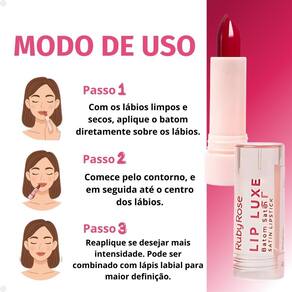 Descubra o poder do acabamento sofisticado com o Batom Satin Lip Luxe Ruby Rose. Sua fórmula cremosa e confortável desliza com facilidade nos lábios, proporcionando cobertura intensa, cor marcante e um toque acetinado irresistível.