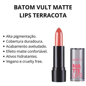 Batom Vult Matte Lips com acabamento matte aveludado. Sua textura confortável tem alta pigmentação e alta cobertura duradoura.O Batom Vult Matte Lips apresenta fórmula enriquecida com Vitamina E, Pantenol e Óleo de Rícino, ativos hidratantes que deixam o efeito matte confortável nos lábios. Sua composição apresenta Tecnologia Real Color: alta pigmentação e cores fiéis da embalagem à sua pele, além, é claro, de ser vegano e cruelty free.