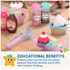 Aprendizado Lúdico: Empilhe as bolas de sorvete em taças ou casquinhas usando a colher fácil de segurar, e finalize com uma banana! O conjunto estimula criatividade, habilidades motoras finas, interação social e resolução de problemas.