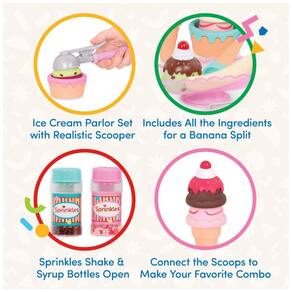 Colher Realista: A colher de sorvete possui alavanca funcional que "scoopa" sorvete de brinquedo, com tampas de xarope que abrem e frascos de granulados agitáveis para diversão saborosa!