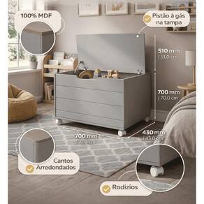 Características do produto: 100% MDF; Pistão à gás na tampa; Rodízios; Cantos Arredondados.