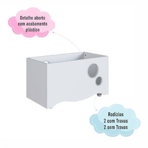 O(a) Baú de Brinquedos Encanto com Rodízios Branco - Completa Móveis é produzido em MDP na escala de brilho Fosco, e possui um grau de dificuldade de montagem: Médio.