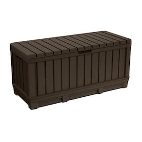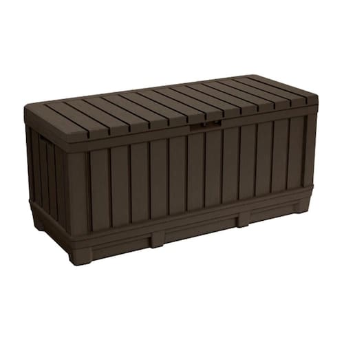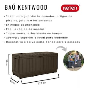 Uma incrível solução de armazenamento de ótima qualidade que também se converte em assento para dois adultos. O baú de armazenamento Kentwood lhe oferece um acabamento com aparência de madeira que complementa qualquer decoração externa. Tem capacidade total de 350L em seu interior, medindo 59 cm de altura, 53.6 cm de largura e 128 cm de comprimento, para você armazenar todos os tipos de objetos. O Baú Kentowood é uma solução ideal para manter o seu quintal organizado e arrumado, com muito espaço para coisas como almofadas de cadeiras, jogos ao ar livre e ferramentas de jardinagem. Fácil de montar, não requer o uso de ferramentas especiais, é feito de material de resina durável, resistente às intempéries e livre de manutenção por anos de uso.