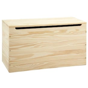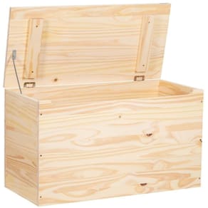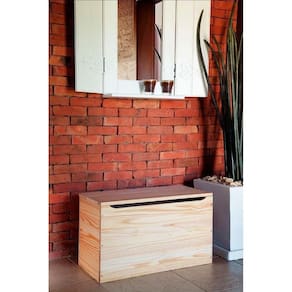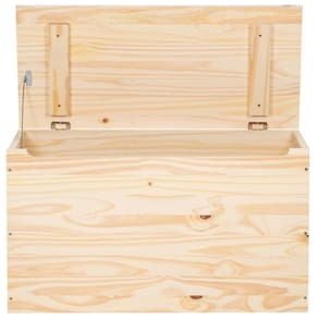 O baú é fabricado com madeira maciça de pinus nas laterais e tampo, e possui fundo em Eucatex, garantindo resistência e durabilidade com um toque natural.
